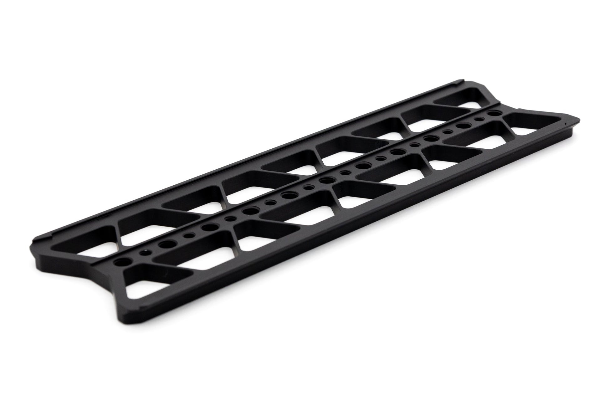 The popular Alexa 35 Universal Stabilizer Plate is now available in a longer version! This new version is twice as long as the original, measuring in at 12"(30cm)! This low-profile and lightweight dovetail plate slides directly into the Arri BUD-1 on the Arri Alexa 35, Alexa 35 Live, and Alexa 265. It allows the user to mount any dovetail plate to the camera cage, only adding 1/8" in height and 230 grams to the camera build. It is profiled to match the bottom of the BUD-1 and has 3/8"-16 threaded holes for mounting.